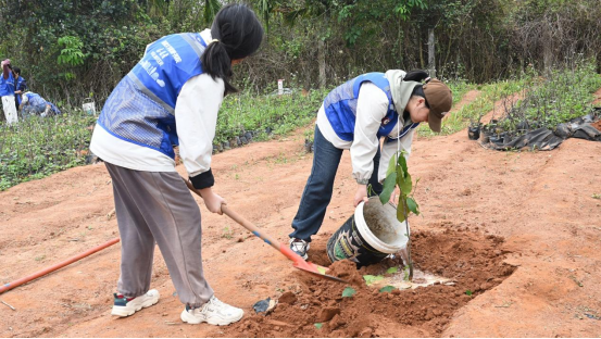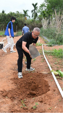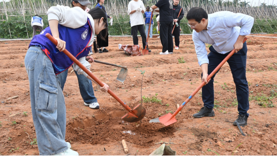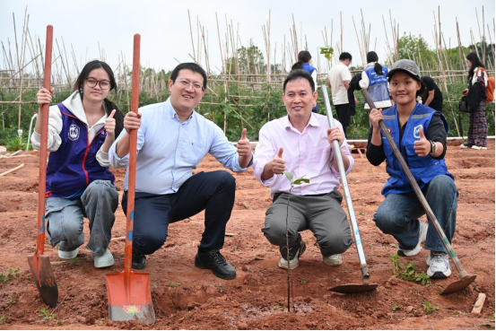 孙涛书记、骆彦平教授与师生们并肩劳作,亲手栽种菠萝蜜树苗。在劳动过程中与同学们亲切交流,孙书记勉励同学们要将生态文明理念融入日常学习与生活,以青春之力践行绿色担当,在劳动实践中感悟奋斗意义,让“爱绿、植绿、护绿、兴绿”的种子在心中生根发芽,用实际行动为美丽校园建设、海南自贸港“绿美”建设贡献青春力量。